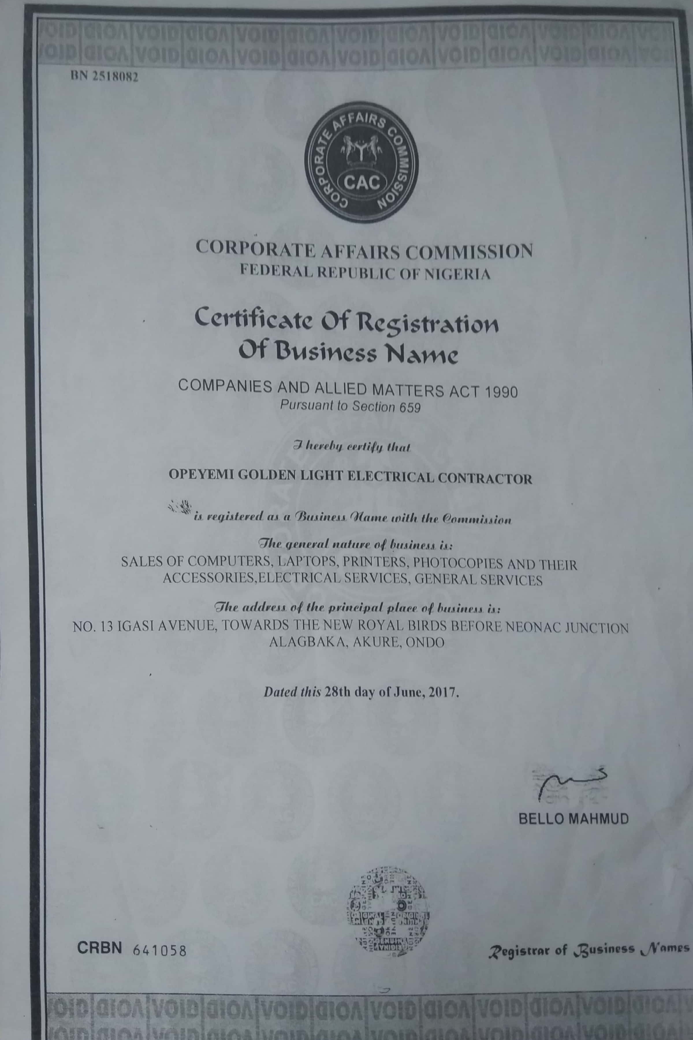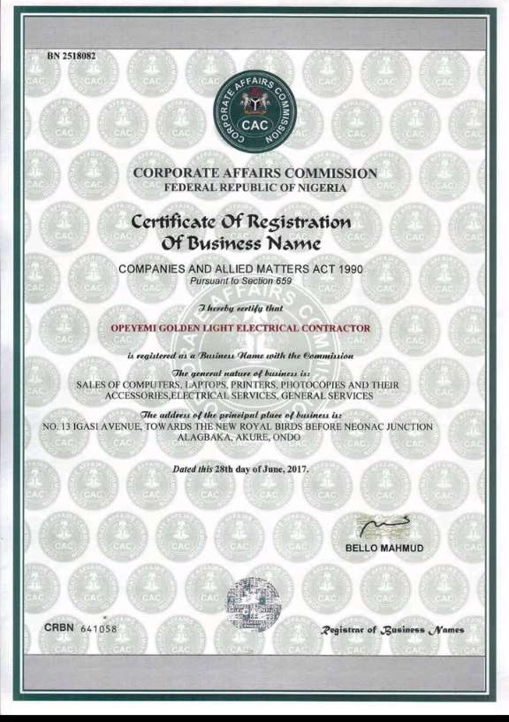 | Business Name | Opeyemi Golden light Electrical Contractor |